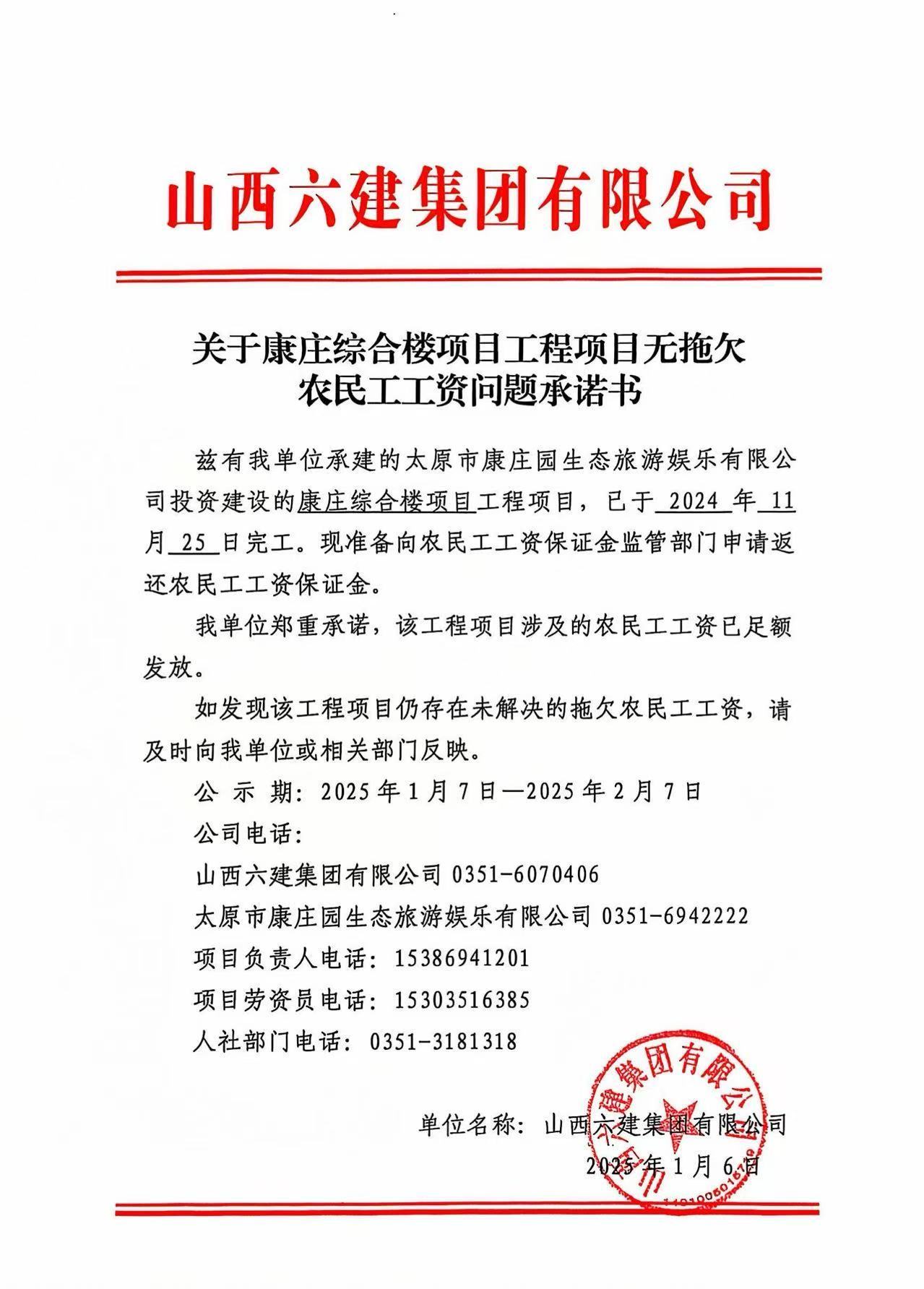 关于对康庄综合楼工程项目无拖欠农民工工资问题承诺书的公示