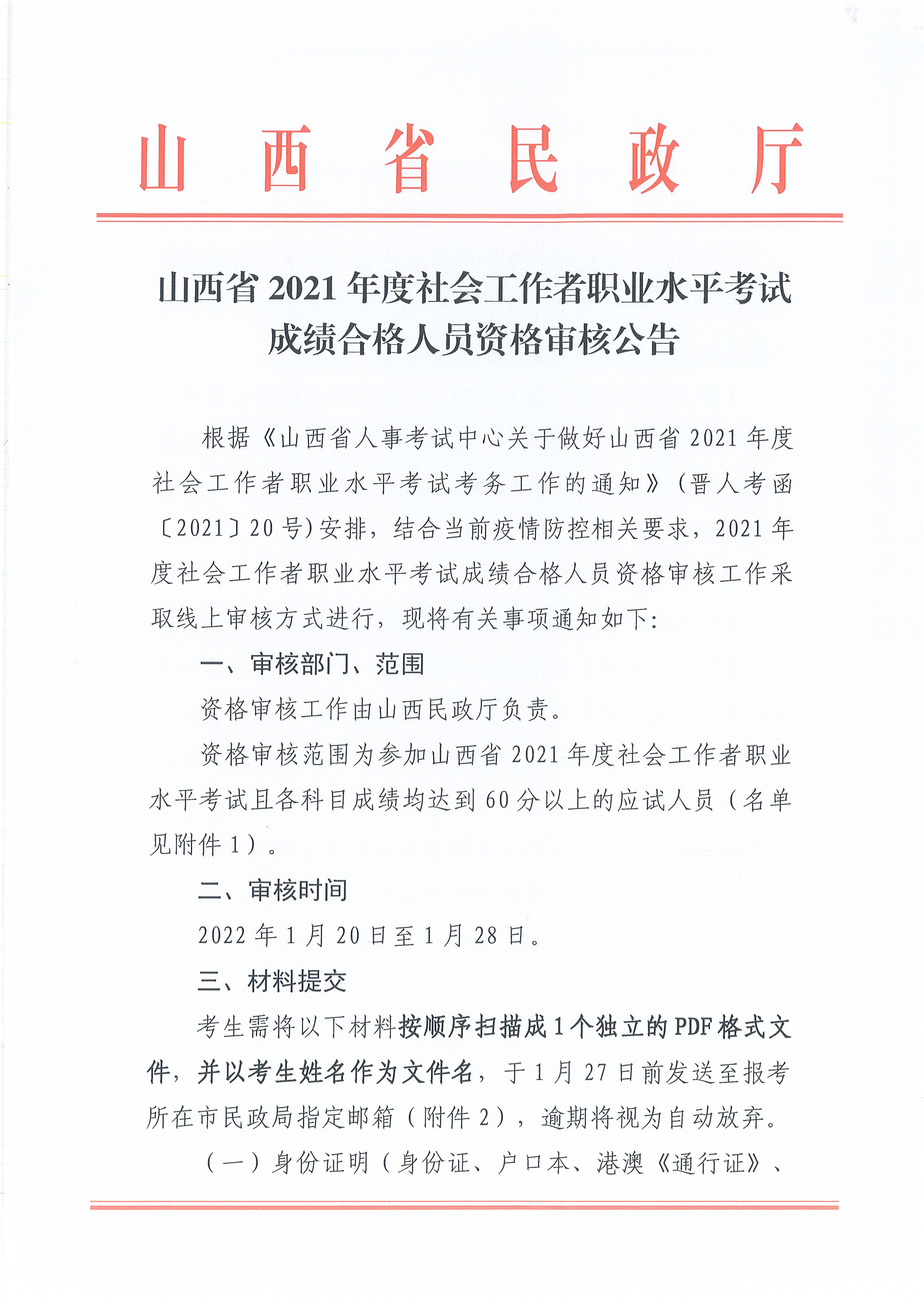 山西省2021年度社会工作者职业水平考试成绩合格人员资格审核公告