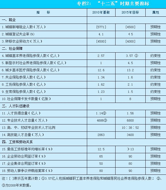 关于印发人力资源和社会保障事业发展“十二五”规划纲要的通知 人社部发〔2011〕71号 各省、自治区、直辖市人力资源社会保障厅(局),福建省公务员局,新疆生产建设兵团人事局、劳动保障局,各副省级市人力资源社会保障(人事、劳动保障)局: 为贯彻落实党的十七届五中全会和十一届全国人大四次会议精神,依据《中华人民共和国国民经济和社会发展第十二个五年规划纲要》,我部组织制定了《人力资源和社会保障事业发展“十二五”规划纲要》(以下简称《规划纲要》)。现印发给你们,请结合实际认真贯彻执行。 《规划纲要》是在全面建设小康社会关键时期编制的一项重要规划,是未来五年人力资源和社会保障工作的重要指导性文件。制定实施《规划纲要》是深入贯彻落实科学发展观、着力保障和改善民生、大力实施人才强国战略的重要举措。各级人力资源社会保障部门要充分认识实施《规划纲要》的重要意义,高度重视《规划纲要》的实施工作,切实加强对规划实施的组织领导。要认真学习《规划纲要》,紧紧围绕“民生为本、人才优先”的工作主线,深刻理解“十二五”时期人力资源和社会保障工作的总体思路、重要指标、重点任务、重大举措和重点项目,进一步增强做好人力资源和社会保障工作的责任感和使命感。要建立规划实施责任制,将《规划纲要》确定的各项目标任务分解到年度、落实到部门、具体到人员。要加强规划实施情况的监督检查和考核评估,确保各项指标和重点任务落实到位。要开展广泛深入的宣传活动,让党和政府的各项惠民利民政策深入人心,赢得广大群众的理解和支持,营造有利于《规划纲要》实施的良好舆论氛围。 各地要根据《规划纲要》精神,结合本地实际,抓紧编制本地区的人力资源和社会保障事业发展“十二五”规划,形成完备的规划体系。 人力资源和社会保障部 二○一一年六月二日 人力资源和社会保障事业发展“十二五”规划纲要 人力资源和社会保障事业发展“十二五”规划纲要,根据《中华人民共和国国民经济和社会发展第十二个五年规划纲要》编制,主要阐明“十二五”时期人力资源和社会保障事业发展的总体思路、发展目标、主要任务和重大政策措施,是未来五年人力资源和社会保障工作的重要指导性文件。 第一章 民生为本人才优先 开创事业发展新局面 第一节 发展环境 “十一五”时期是我国发展史上极不平凡的五年,也是人力资源和社会保障事业迈出重要步伐、取得突出成绩的五年。五年来,面对国内外环境复杂多变、国际金融危机巨大冲击、汶川特大地震等重大自然灾害多发频发等重大挑战,人力资源社会保障部门坚决贯彻党中央、国务院的决策部署,迎难而上,努力拼搏,全面完成了“十一五”时期各项任务。积极就业政策体系更加完善,就业规模持续扩大,就业局势保持稳定。覆盖城乡居民的社会保障体系框架初步形成,社会保障制度建设实现重大突破,社会保险待遇水平大幅提高。人才资源总量不断增长,人才队伍素质明显提高,为经济社会发展提供了有力的人才和智力支持。公务员制度不断完善、队伍建设不断加强,事业单位人事制度改革稳步推进,军队转业干部安置任务圆满完成。工资收入分配制度改革取得阶段性成果,职工工资水平稳步提高。劳动关系协调机制、劳动争议调处机制和劳动保障监察执法机制逐步完善,劳动关系总体保持和谐稳定。“十一五”时期人力资源和社会保障事业的快速发展,为保障和改善民生、维护改革发展稳定大局做出了重要贡献,也为今后事业发展奠定了坚实基础。 同时必须清醒地看到,“十二五”时期,人力资源和社会保障事业发展仍面临着诸多挑战。从国际看,国际金融危机影响深远,世界经济增长速度减缓,各种形式的保护主义抬头,我国发展的外部环境更趋复杂。从国内看,我国发展中不平衡、不协调、不可持续的问题依然突出,制约科学发展的体制机制障碍依然较多。从事业发展自身看,也还面临许多深层次矛盾和突出问题。主要表现在:就业形势更加复杂,就业总量压力和结构性矛盾并存,高校毕业生等重点群体就业问题依然十分突出;社会保障体系在体现公平性、适应流动性、保证可持续性等方面均有待加强;人才队伍建设与更好实施人才强国战略的要求还不相适应,高层次创新型人才成长发展机制尚不健全;充满生机活力的选人用人机制和科学的评价机制尚未形成;职工工资正常增长机制和支付保障机制还不完善,工资收入分配差距较大;劳动关系协调机制、纠纷调处机制和劳动监察执法机制还不完善,劳动关系领域进入矛盾多发期;人力资源和社会保障公共服务能力比较薄弱,难以满足人民群众日益增长的公共服务需求。我们必须深刻认识“十二五”时期人力资源和社会保障事业面临的新形势新任务新要求,紧紧抓住机遇,积极应对挑战,加快解决突出矛盾和问题,开创人力资源和社会保障事业发展新局面。 第二节 指导思想 高举中国特色社会主义伟大旗帜,以邓小平理论和“三个代表”重要思想为指导,深入贯彻落实科学发展观,适应加快转变经济发展方式的新要求,顺应城乡人民过上更好生活的新期待,坚持以民生为本、人才优先为主线,实施就业优先战略和人才强国战略,健全覆盖城乡居民的社会保障体系,深化机关事业单位